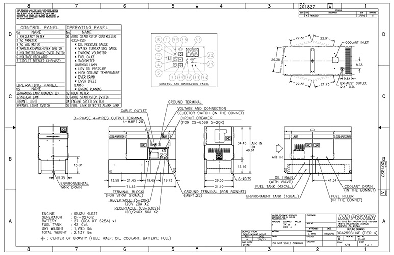 A comprehensive analog control panel provides instrumentation including AC ammeter, AC voltmeter, frequency meter, AC circuit breaker, engine gauges and much more.